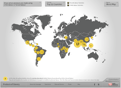 Impulsada per l’organització Anti-Slavery International, la pàgina ProductsOfSlavery.org plasma en un mapamundi les darreres dades del Departament de Treball dels EUA sobre l’explotació laboral infantil i els treballadors forçats adults a tot el món. L’estudi, en concret, va detectar al mercat fins a cent vint-i-dos productes de consum habitual fets a partir de mà d’obra esclavitzada, i provinents d’una seixantena de països de l’hemisferi sud.